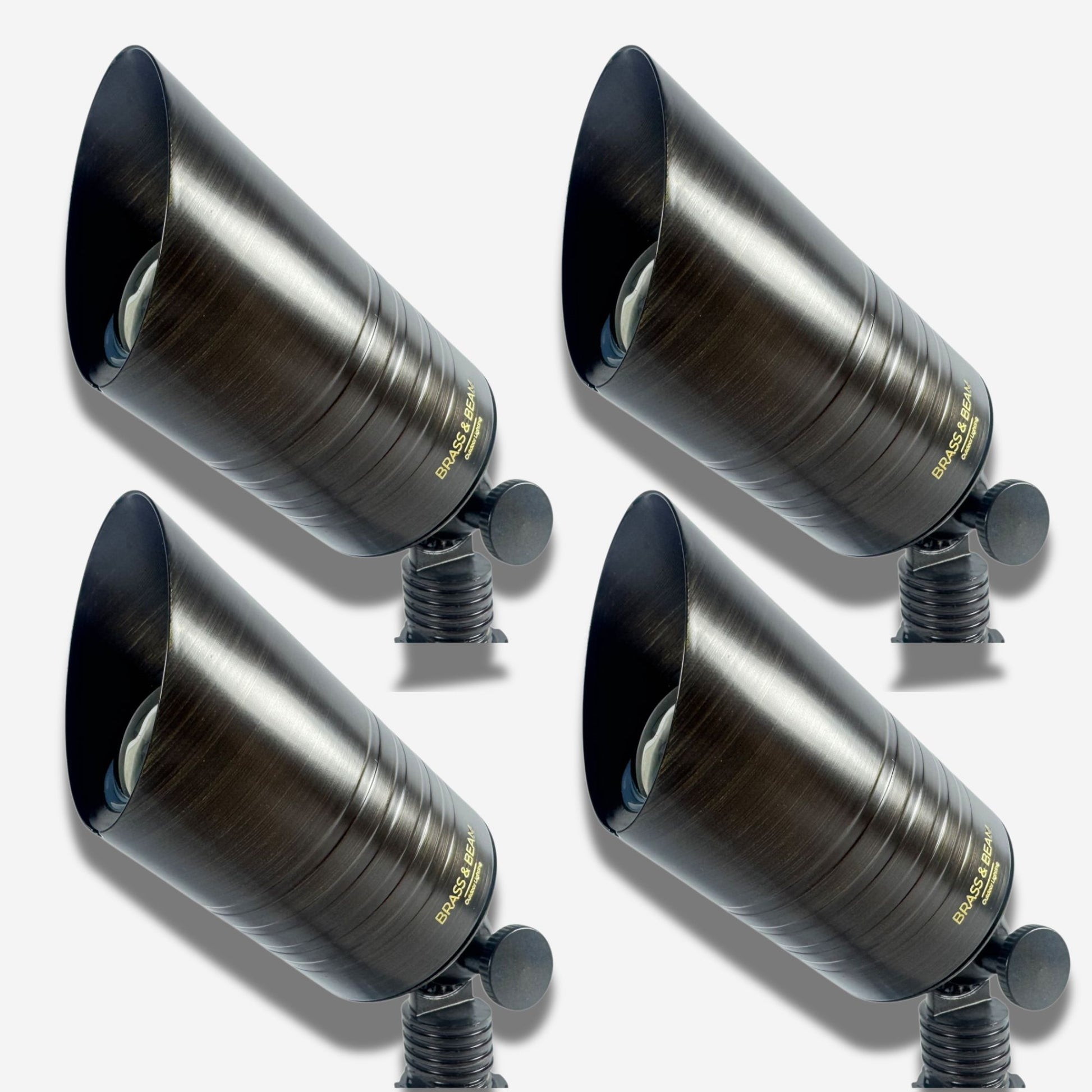 4-Pack Solid Brass Landscape Spotlights. Professional-grade 12V low-voltage outdoor lighting. Weatherproof IP65 rated. Cast brass construction with lifetime warranty. Compatible with all 12V transformers. Perfect for pathways, gardens, driveways, and architectural lighting.